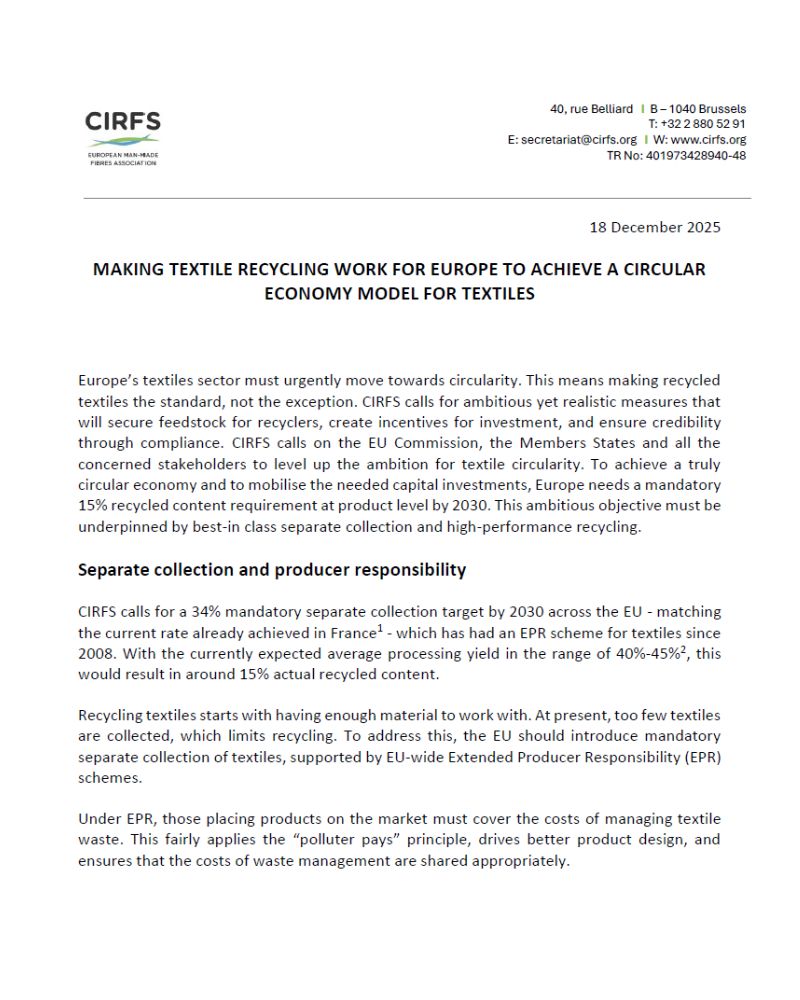 CIRFS calls for a mandatory 34% separate collection rate for textiles in every EU Member State by 2030, supported by harmonised Extended Producer Responsibility (EPR) schemes. Achieving this collection level would enable a 15% mandatory recycled content requirement in textile products by 2030, measured through a physical, polymer‑only mass‑balance approach. T